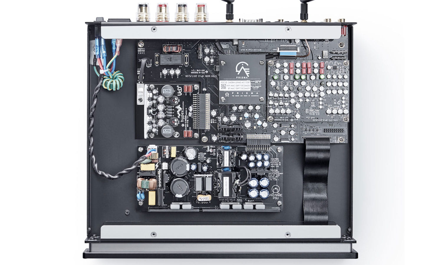 W niewielkiej obudowie, mniejszej niż klasyczne HiFi PRIMARE I15 Prisma mieści sekcję wzmacniająca audio, który wykorzystuje wiodący w swojej klasie analogowy stopień wyjściowy Hypex, zapewniający 60 watów mocy. Równie imponujący jest stopień konwersji cyfrowo-analogowej, zdolny do przetwarzania plików muzycznych z rozdzielczością do PCM 384 kHz i możliwościami DSD 128.