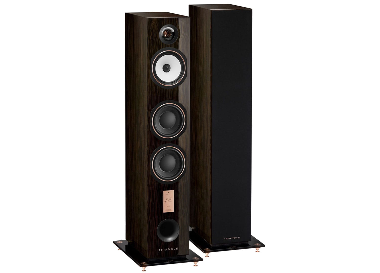 TRIANGLE 40th-anniversary Antal są dostarczane z elegancką podstawą szklaną formowaną termicznie i zestawem kolców w kolorze różowego złota do wykorzystania w zależności od rodzaju podłoża na którym będą ustawione. Kolumny te spodobają się wszystkim poszukującym nowoczesnej obudowy wykończonej rzadkim fornirem, która łączy się z zaawansowanymi technologiami akustycznymi TRIANGLE. TRIANGLE 40th-anniversary Antal zostały zaprojektowane i opracowana z dbałością o wyjątkowe wrażenia muzyczne i najlepiej zaprezentują się w pomieszczeniu o powierzchni od 30 do 50m².